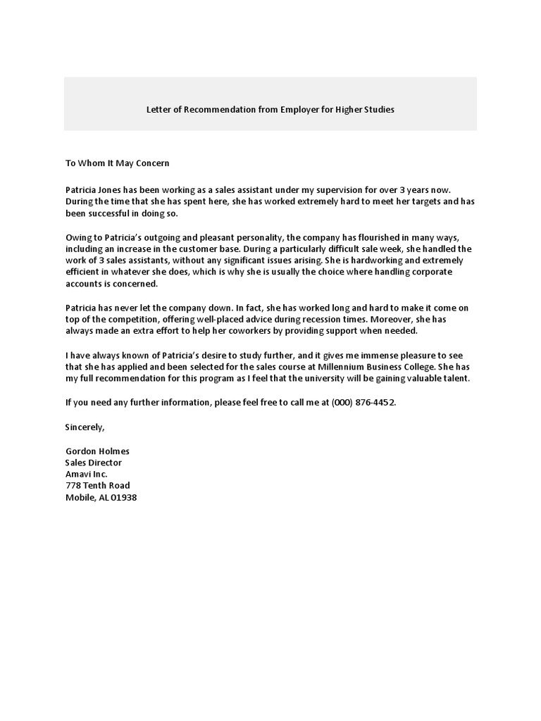 Recommendation Letter From Employer For Higher Studies