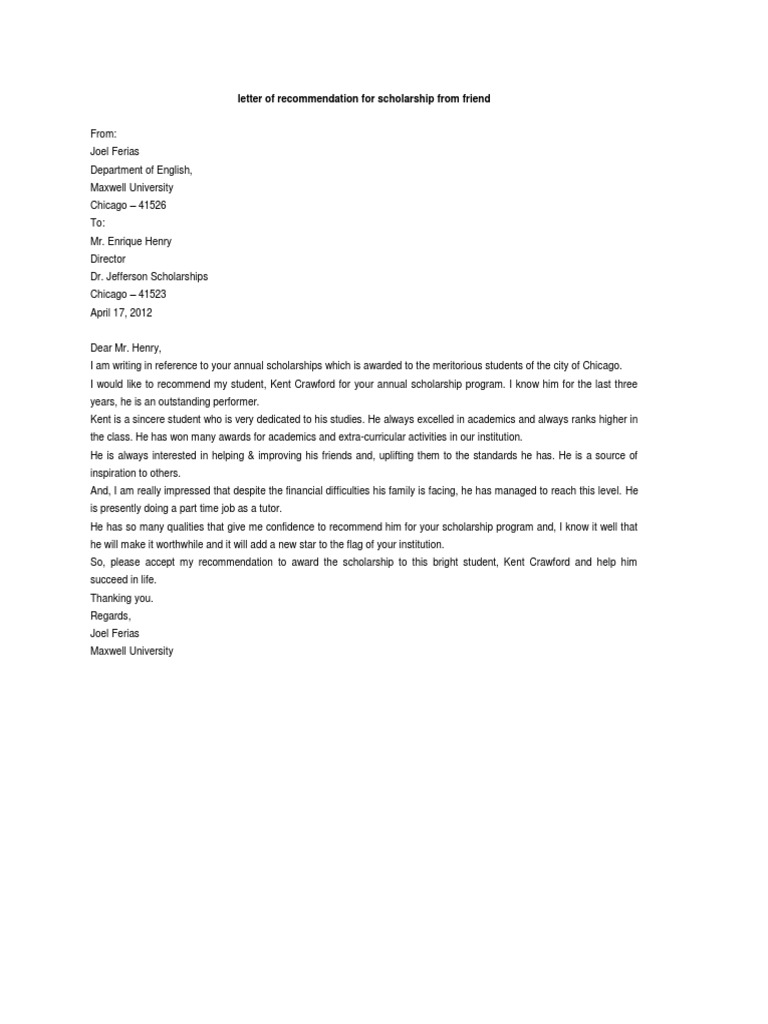 Scholarship recommendation letter from friend. I have known him her for the last number of months and years and strongly state that he she is a deserving candidate that will make you proud to possess as an example of your ideal scholarship winner. Make sure you mention the candidates academic merit. At the very top left of the letter should be the letterhead.